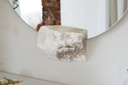 A round wall mirror, supported by a white alabaster cut off rests in contoured groove that allows the mirror to sit securely, creating the illusion of a flawless seam from stone to glass.