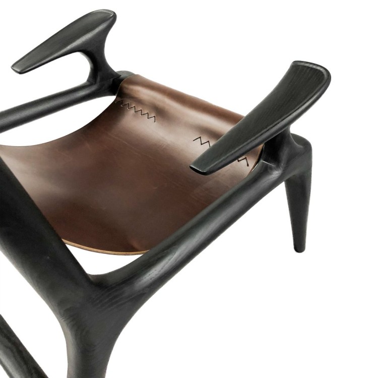 This award-winning leather and wood sling chair is the inaugural piece designed by Fernweh Woodworking. The frame is hand-shaped and is available in high quality Walnut, White Ash in Danish Soap finish, or Charcoal Ash. The sleek joinery is inspired by Danish and Scandinavian design. Slung with high quality, comfortable, hand-stitched black or brown leather, this chair will make a statement in any room.