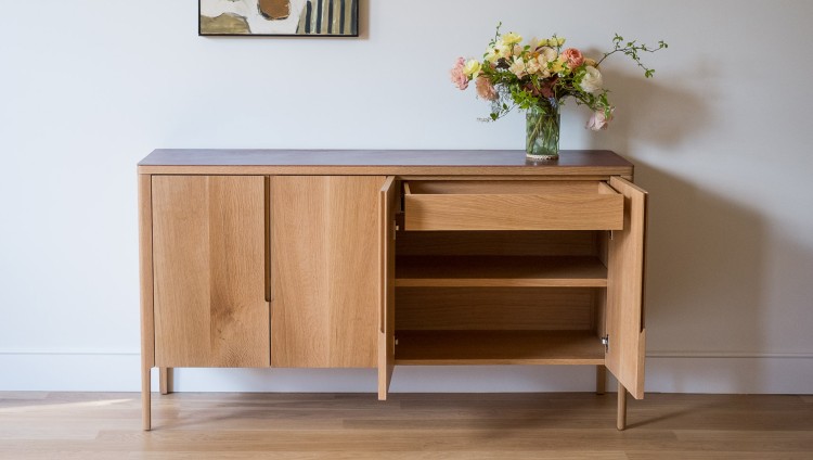 The Harvest Sideboard is designed to house glassware, spirits, and accouterment. The front features hand-sawn veneered doors with integrated pulls. The top is clad in hand finished, full grain leather - a material chosen for its natural beauty and texture.