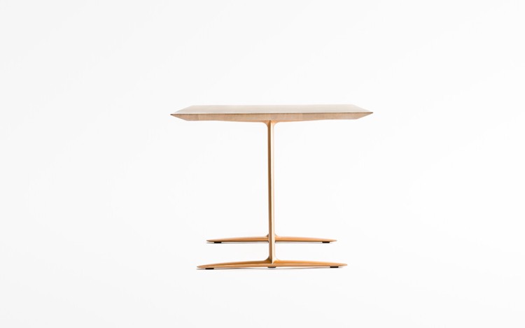 The Bridge across is a table with bronze (copper) legs and a wooden tabletop. The bronze legs have a simple structure so it does not obstruct the chairs. Also, to construct the table with simple parts, sand-casted parts are used to join the ellipse supporting post for the legs and bottom legs with the wooden tabletop. For the legs, the same original sand-cast mold is used. The same original mold is used for both legs, and the ellipse crosspieces connecting the two legs are joined together with the legs using spigot joints.