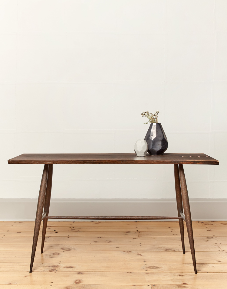 Naturally oxidized subtle live edge oak top with slender turned legs and handcrafted copper staples.