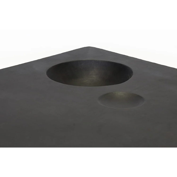 Handmade entirely out of blackened and waxed steel, this table features geometric voids within the table itself. Also available with food-safe, ceramic, bowl inserts. Each one is made specifically to our clients’ specifications and needs.